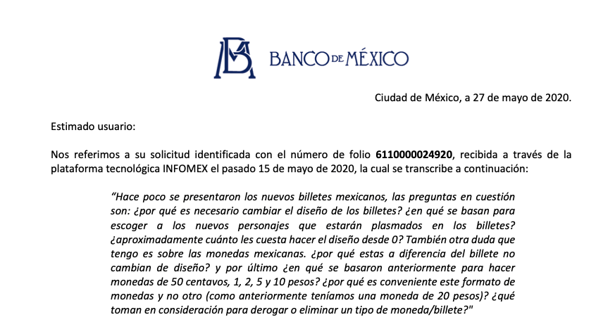 Es la segunda vez que Priscila Pregunta recurre al Banco de México, que como sujeto obligado admito es mejor que otros, pues responde las preguntas de acceso a la información pública de forma limpia y sin hacer sufrir al ciudadano como otras instancias.