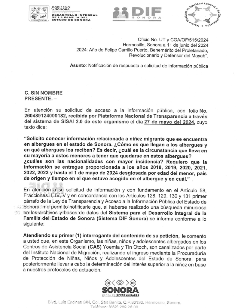 «Son canalizados por parte del Instituto Nacional de Migración, realizando el ingreso mediante la Procuraduría de Protección de Niñas, Niños y Adolescentes del Estado de Sonora, para posteriormente llevar a cabo la determinación del interés superior a la niñez en base a nuestros protocolos de actuación», fue la respuesta.