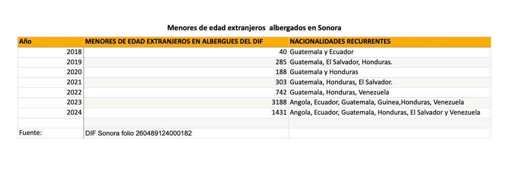 Las cifras muestran que en 2023 en albergues del DIF Sonora se recibió a un total de 3 mil 188 menores de edad, pero ahora las nacionalidades de mayor incidencia fueron Angola, Ecuador, Guatemala, Guinea,Honduras, Venezuela.