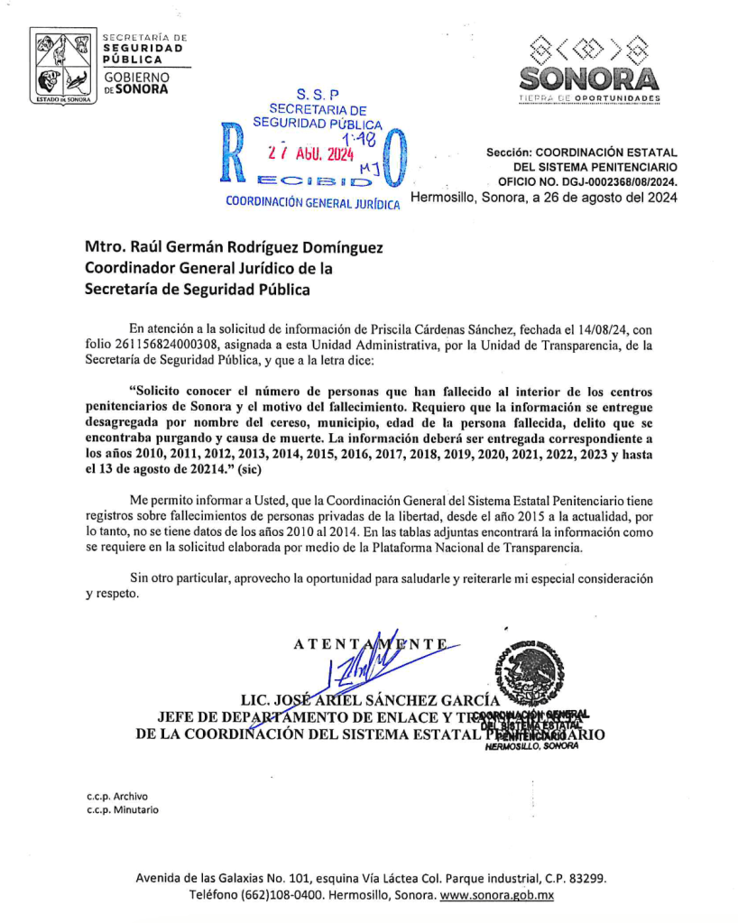 Tampoco me imaginé que de 2010 a 2014 no hubiera datos, según declaran en la solicitud de acceso a la información pública con folio 261156824000308. La información se entregó bien estructurada con un registro tal como lo solicité: ¿en qué cárcel falleció? ¿qué delito estaba purgando? ¿cuántos años tenía? ¿de qué murió? y la fecha.